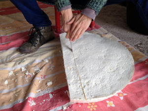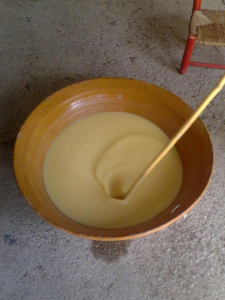 3- Una vez se disuelve la sosa con el agua se añade el aceite lentamente mientras no deja de dársele vueltas en la misma dirección. Hay que darle vueltas durante un cuarto de hora sin parar.